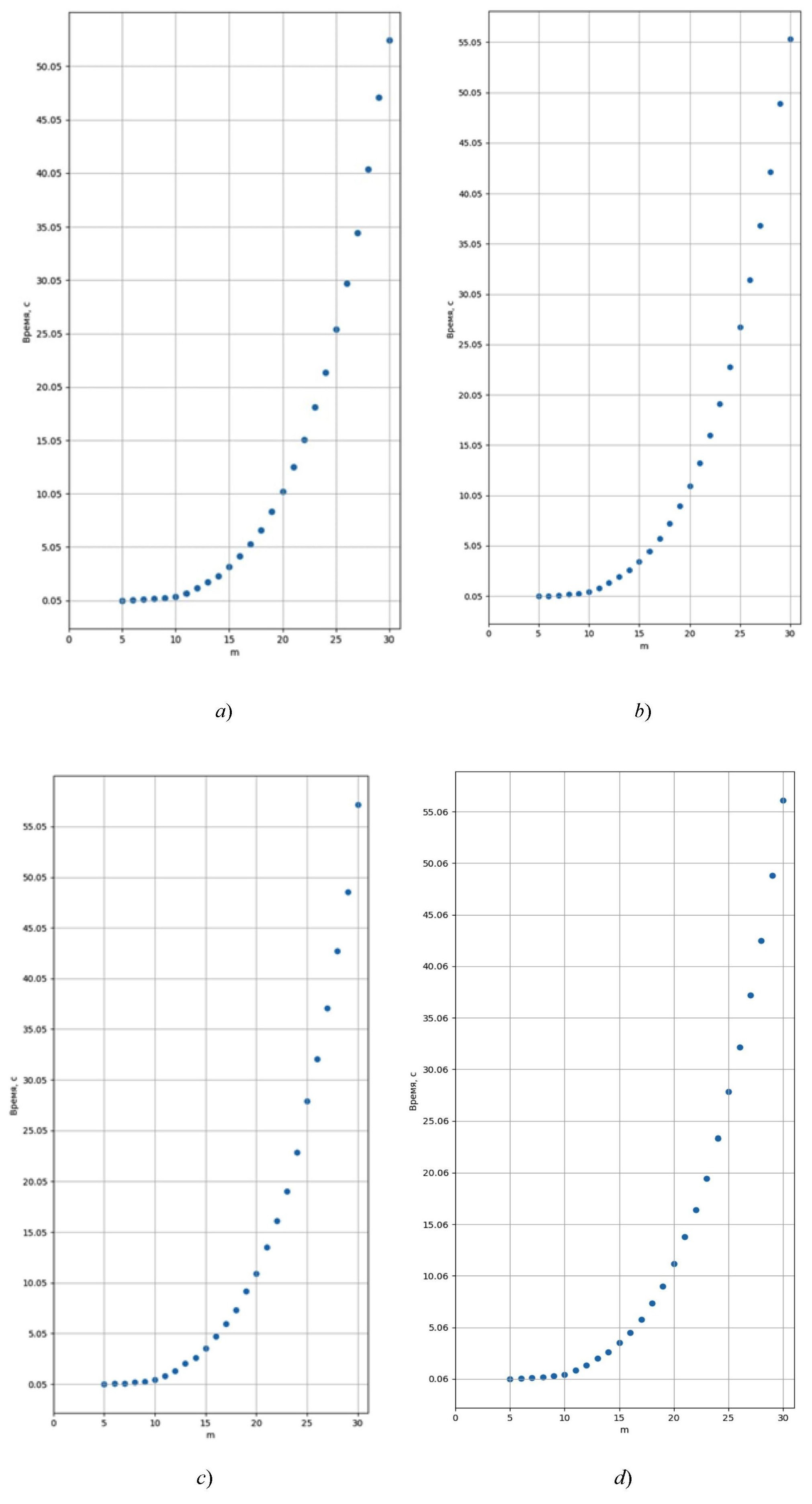 Рисунок. Графики зависимостей скорости работы алгоритма от размерности матрицы A при условиях: