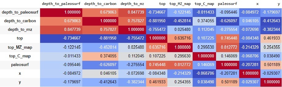 4 | prev_index | Предыдущий индекс – проинтерпретированный класс предшествующего (меньшего по глубине) слоя в данной скважине. Важный параметр, поскольку в большинстве случаев породы залегают последовательно и более древние породы не могут залегать выше более молодых |