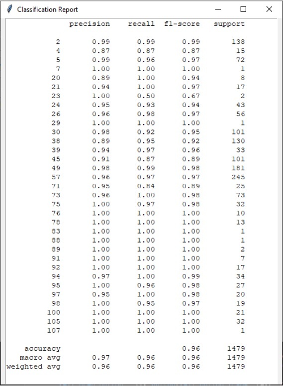 После завершения обучения модели выполняется анализ результатов обучения, включающий оценку точности модели на тестовых данных, генерацию отчета о классификации и другие метрики оценивания модели (рис. 6).