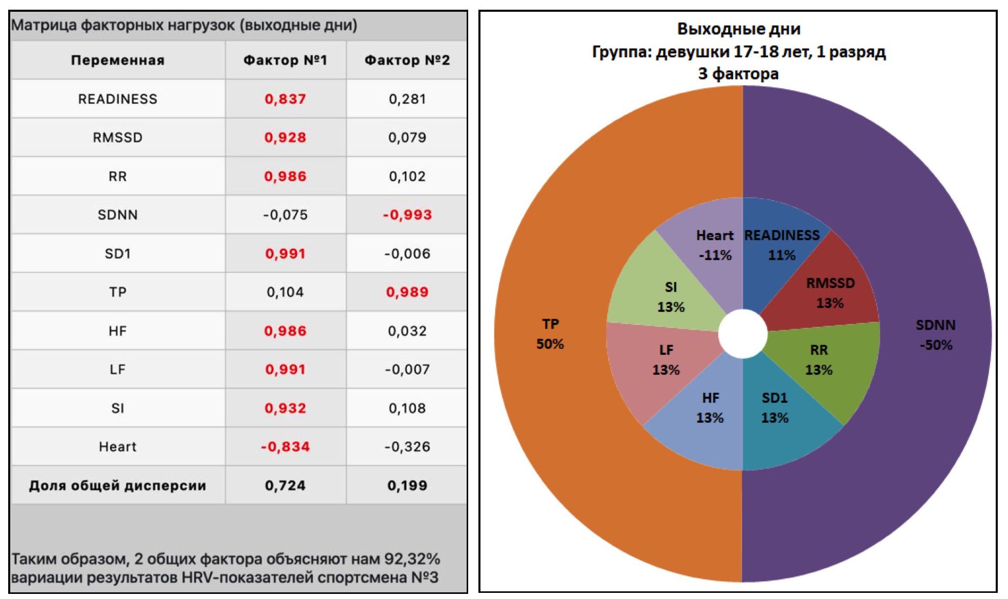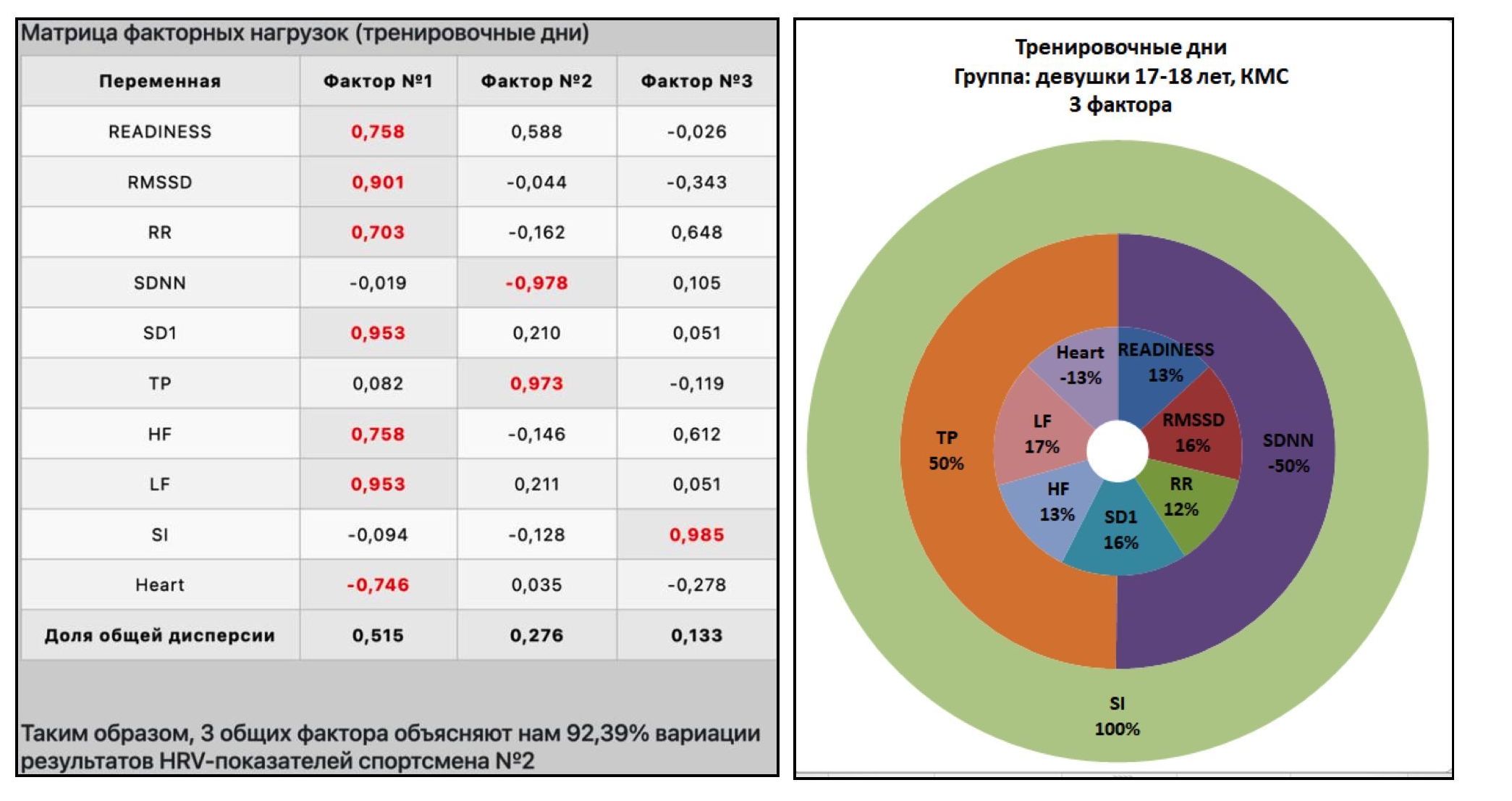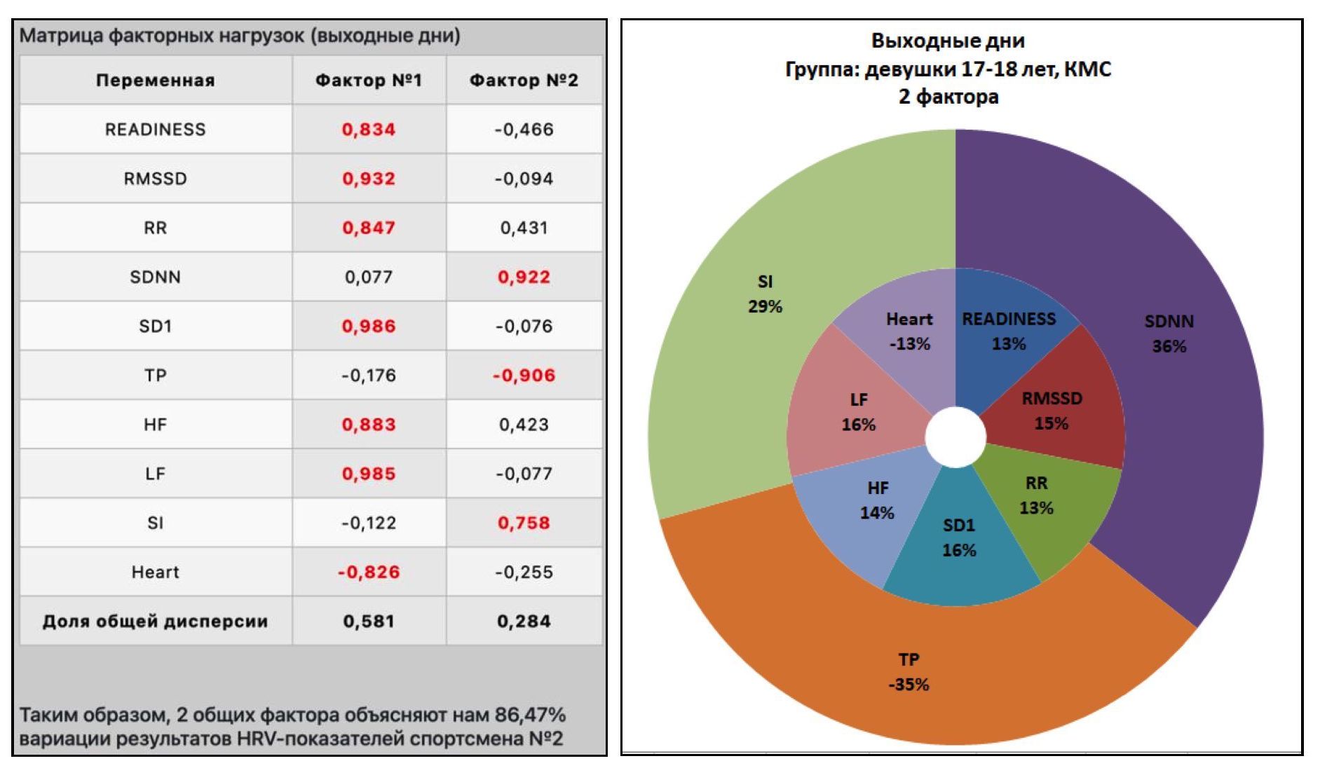 Так, на рисунке 11 представлены матрица факторных нагрузок и кольцевая диаграмма для спортсмена №2 из группы «Девушки 17-18 лет, КМС» в тренировочные дни, а на рисунке 12 – в выходные дни.