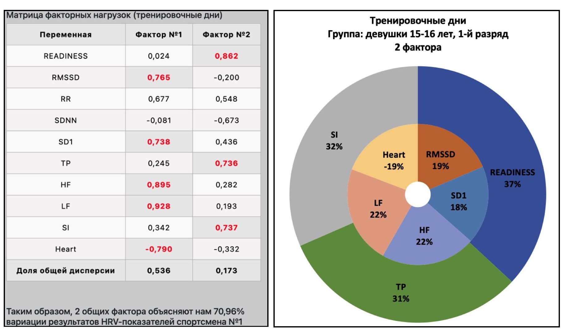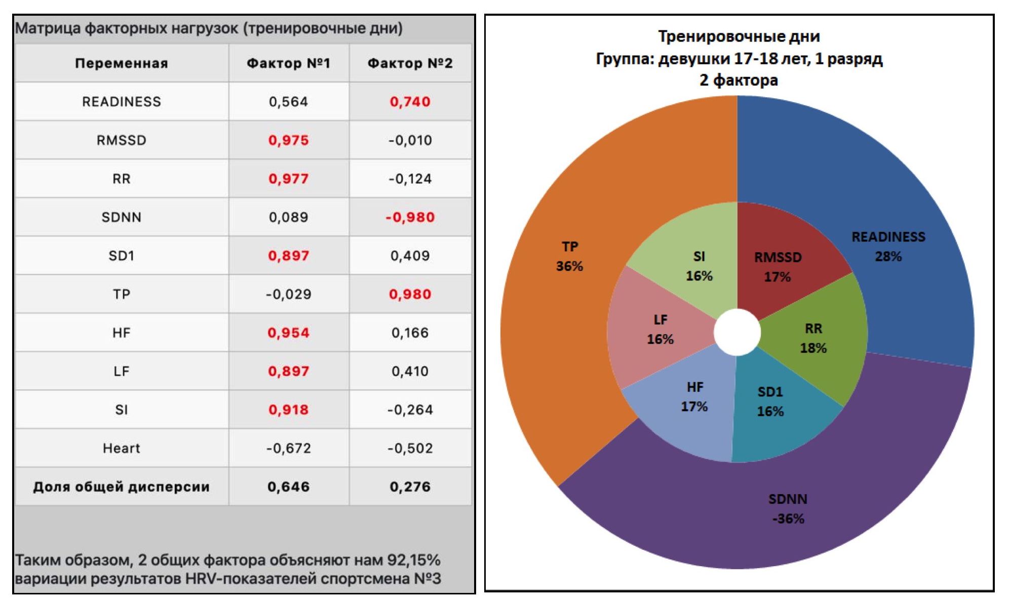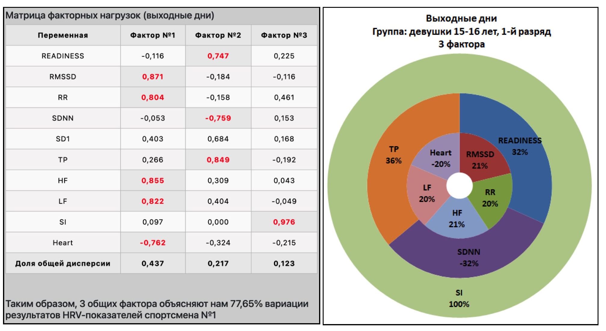 Так, на рисунке 11 представлены матрица факторных нагрузок и кольцевая диаграмма для спортсмена №2 из группы «Девушки 17-18 лет, КМС» в тренировочные дни, а на рисунке 12 – в выходные дни.