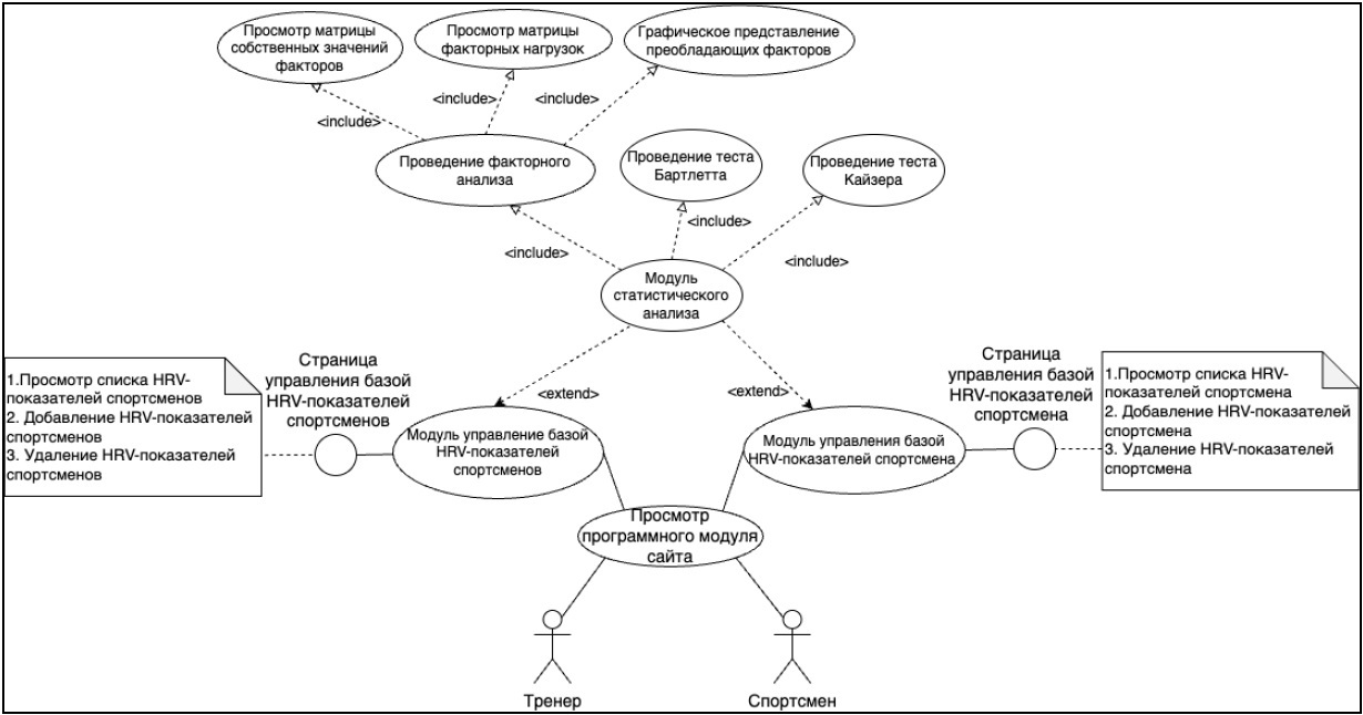 Поскольку все подобные исследования сопряжены с получением и обработкой большого объема данных, было решено разработать модуль программно-информационной системы для исследования зависимостей между показателями сердечно-сосудистой системы спортсменов методом факторного анализа, который позволит выявить взаимосвязи и зависимости между различными показателями сердечно-сосудистой системы спортсменов, понять физиологические особенности и индивидуальные потребности каждого спортсмена, оптимизировать тренировочные программы, учитывая выявленные зависимости.