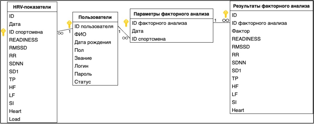 В программном модуле была создана база данных, которая хранит как ежедневно измеряемые значения HRV-показателей каждого спортсмена, так и параметры тестов, проводимых методом факторного анализа, а также результаты этих тестов. Структура базы данных приведена на рисунке 2: