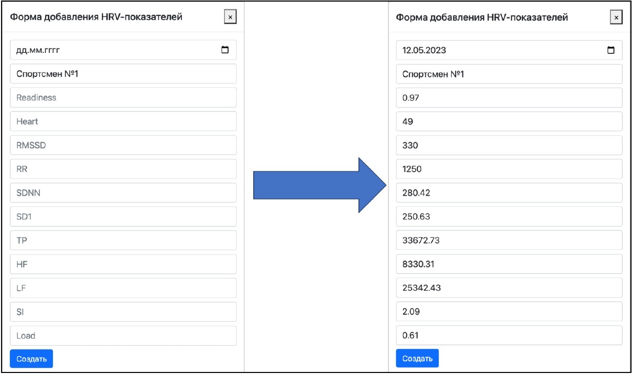 После авторизации пользователя в программно-информационной системе у спортсмена появляется возможность ввести свои HRV-показатели с помощью заполнения соответствующей формы добавления (см. рис. 3).