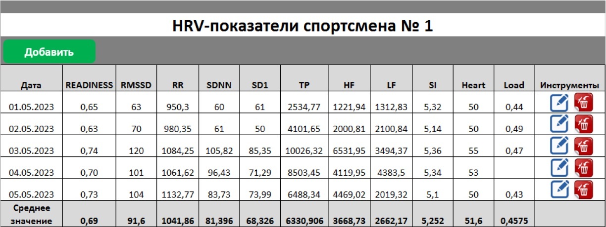 Также можно увидеть таблицу всех ранее введенных значений HRV-показателей, в которой можно произвести их редактирование или удаление. Внизу таблицы рассчитаны средние значения каждого из показателей за выбранный период времени (см. рис. 4).