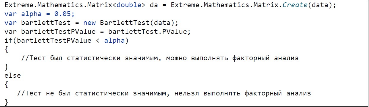 На рисунке 5 представлен листинг программы для проведения теста сферичности Бартлетта. Создается объект класса BartlettTest, в который передается набор входных данных, после этого необходимо сравнить значение свойства PValue этого объекта с заданным уровнем статистической значимости.
