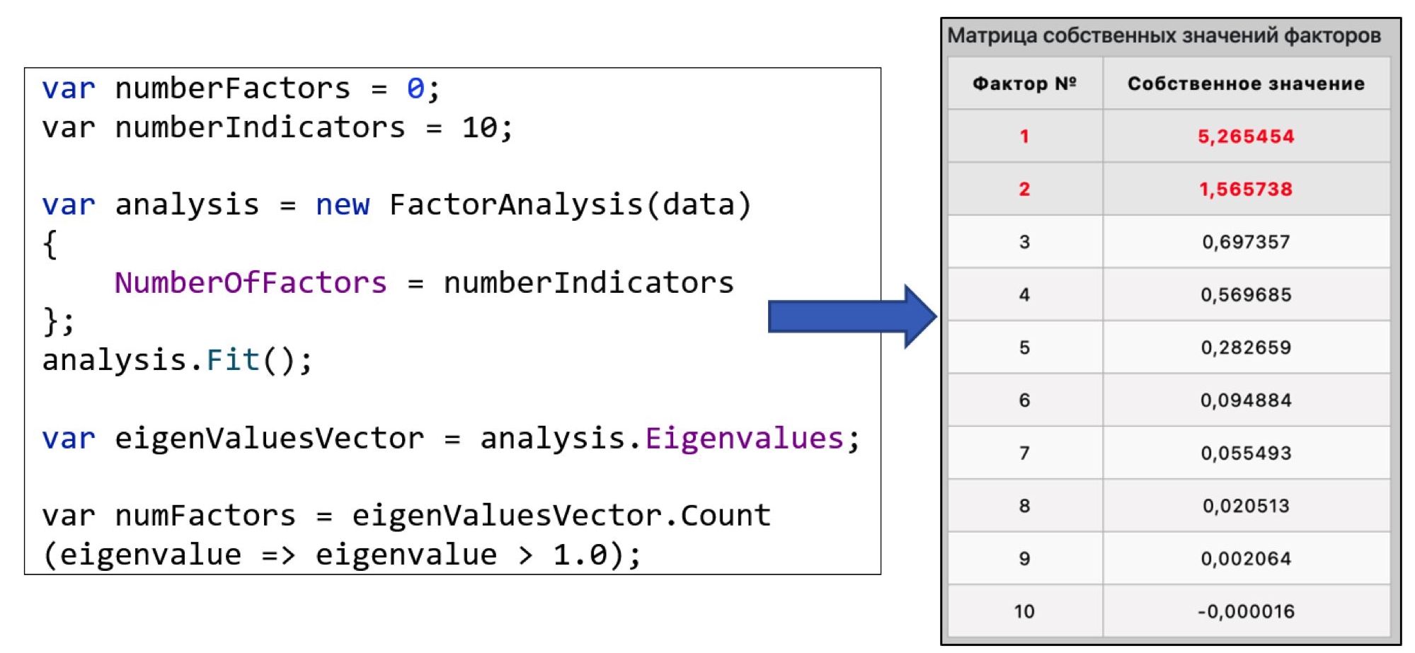 - выбор оптимального количества факторов методом Кайзера;
