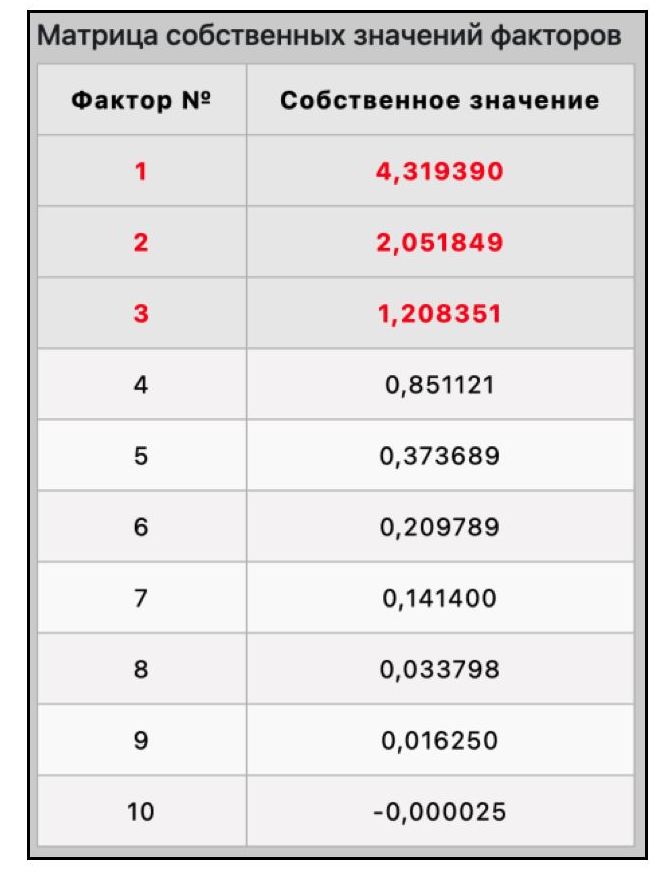 Далее необходимо выбрать оптимальное количество факторов, например, с помощью критерия Кайзера. Нужно отобрать только факторы с собственными значениями, большими 1, поскольку, если фактор не выделяет дисперсию, эквивалентную, по крайней мере, дисперсии одной переменной, то он опускается.