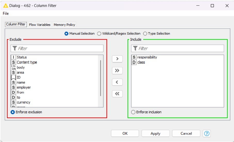 Далее используем узел Column Filter, он необходим для фильтрации данных, так как для решения задачи необходимо оставить класс ваканссии (class) и перечень требований к кандидату (responsibility) (рис. 5).