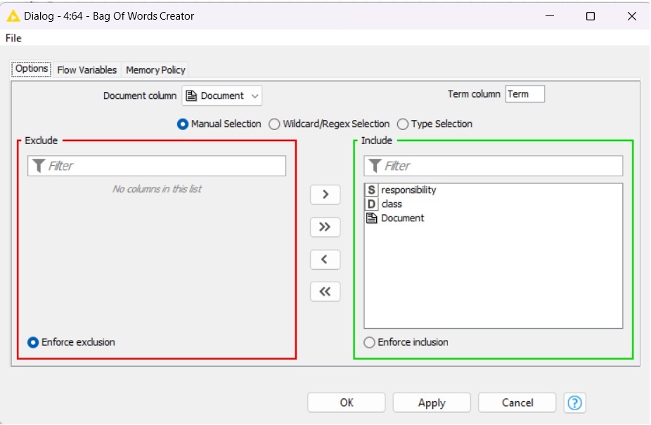 Шаг 3. Переходим к формированию пакета слов для вакансий. Используем узел Bag Of Words Creator. Пакет слов состоит из столбцов, содержащих термины, встречающиеся в соответствующем документе (вакансии). Все столбцы, связанные с терминами, такие как столбец документа, можно выбрать в диалоговом окне конфигурации узла. В нашем случае в конфигурации выбираем параметры «Document», «class» и «responsobility» (рис. 7).