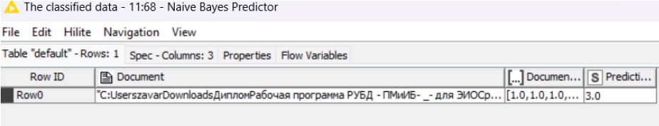 Узел Naive Bayes Learner является входным для узла Naive Bayes Predictor, который прогнозирует класс документа содержащего рабочую программу на основе обученной байесовской модели.