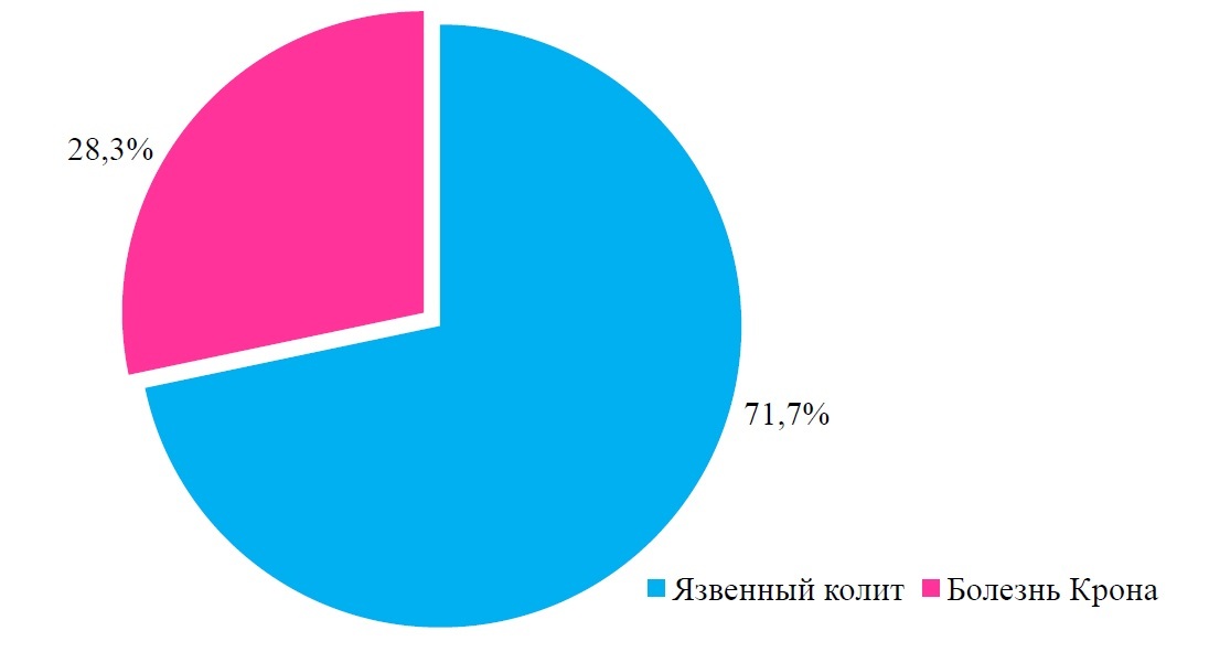 В ходе нашей работы было выявлено, что в структуре ВЗК превалирует язвенный колит (71,7%), удельный вес болезни Крона составил – 28,3% (рис. 1).