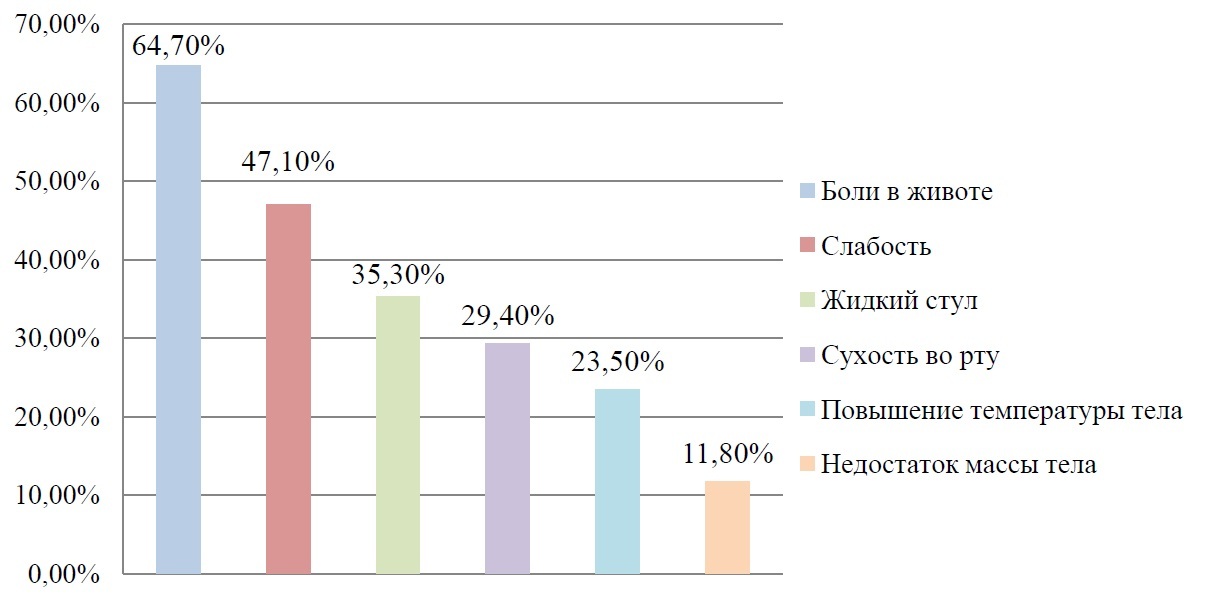 В клинической картине болезни Крона преобладали: боли в животе – 11 (64,7%) случаев, слабость – 7 (47,1%) случаев, жидкий стул – 6 (35,3%) случаев, сухость во рту – 5 (29,4%) случаев. Следующие проявления БК встречались в дебюте заболевания значительно реже: повышение температуры тела – 4 (23,5%) случая, недостаток массы тела – 2 (11,8%) случая (рис. 4).