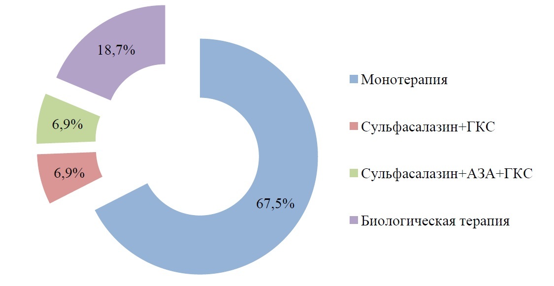 В процессе дальнейшего наблюдения за данными пациентами мы проанализировали варианты проведения терапии. При язвенном колите монотерапию салофальком/сульфасалазином получали 29 (67,5%) пациентов. Комбинацию препаратов (сульфасалазин + глюкокортикостероид (ГКС)) использовали 3 (6,9%) человека. Пациенты с язвенным колитом среднетяжелой и тяжелой степеней получали терапию комбинацией из трех базисных препаратов: сульфасалазин, азатиоприн (АЗА) и ГКС. Данных больных выявлено 3(6,9%) человека. Биологическую терапию по жизненным показаниям получали 8 (18,7%) пациентов (рис. 5).