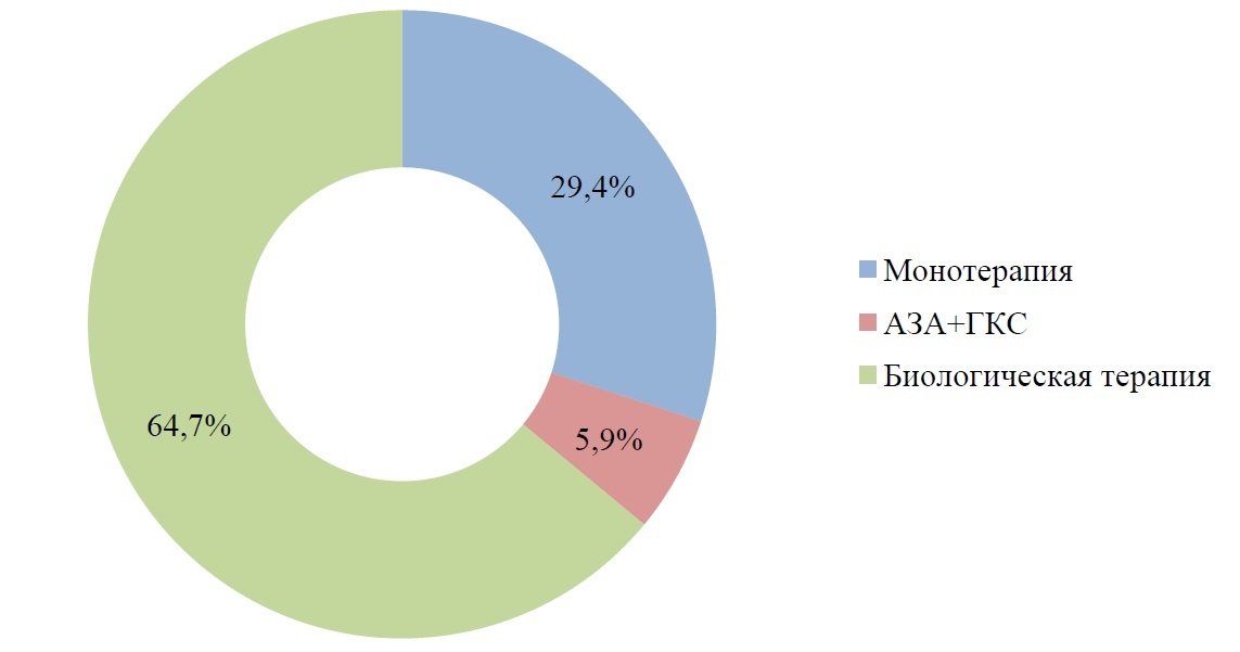 При болезни Крона монотерапию агатиоприном/преднизолоном получали 5 (29,4%) пациентов. Комбинацию препаратов (АЗА + ГКС) получал 1 (5,9%) человек. Биологическую терапию по жизненным показаниям получали 11 (64,7%) пациентов (рис. 6).
