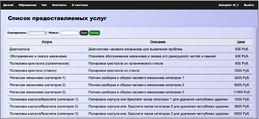После авторизации пользователь попадает на главную страницу, на которой представлен прайс-лист на услуги часового сервиса с возможностями сортировки и поиска по различным критериям, а также экспортом результата в pdf-формат (см. рис. 3).