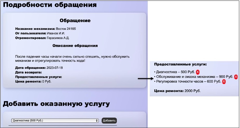 После завершения работы над обращением необходимо добавить предоставленные в ходе ремонта услуги (см. рис. 7).