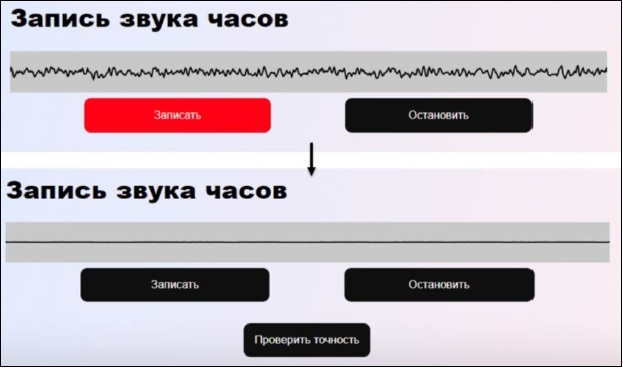 Второй способ — это оценка точности через микрофон компьютера. Работнику необходимо приложить часы к микрофону и начать запись, после чего аудиофайл будет отправлен на сервер для дальнейшей обработки (см. рис. 10).