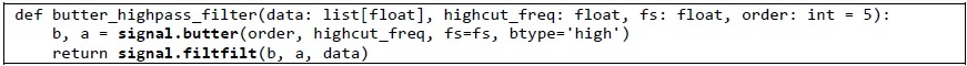 Фильтрация высоких частот происходит путем плавного подавления сигнала, частота которого находится ниже заданного порога. В данном случае используется реализация этого фильтра в виде функции signal.butter() из библиотеки scipy [4]. Она принимает в качестве аргументов порядок фильтрации, который влияет на степень фильтрации, пороговую частоту для фильтрации, частоту дискретизации аудиофайла и тип фильтрации. В качестве выходных данных эта функция возвращает параметры фильтрации, принимаемые в качестве аргументов функции signal.filtfilt(), которая накладывает фильтрацию на сигнал, наряду с данными, которые необходимо отфильтровать (см. рис. 11).
