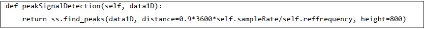 Для нахождения пиков используется функция signal.find_peaks() из библиотеки scipy. В качества аргументов она принимает исходный сигнал, предполагаемое расстояние между пиками и их высоту (см. рис. 13).