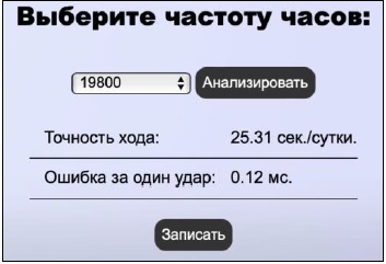 «Анализировать» на сервере запускается вышеописанный процесс, который оценивает точность хода часов. Результат оценки представлен в виде показателей отклонения хода за один удар и за сутки (см. рис. 18).