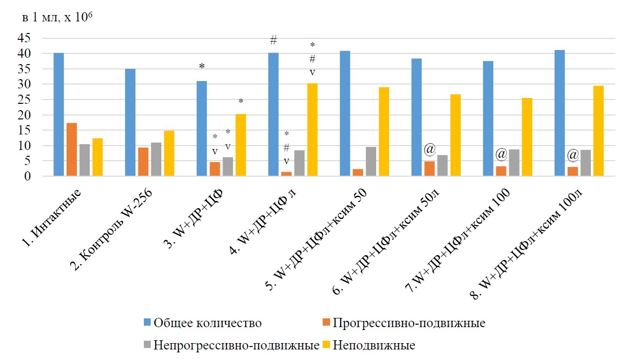 Цель работы: оценить изменения параметров спермограммы крыс с карциномой Уокер-256 при использовании липосомальной комбинации доксорубицина и циклофосфамида в сочетании с ксимедоном в свободной и липосомальной формах.