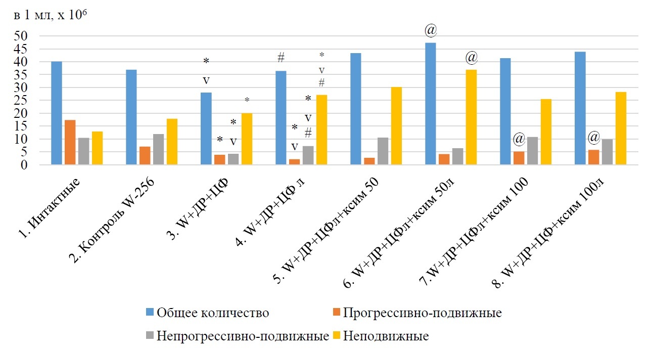 Относительно прогрессивно-подвижных сперматозоидов группы с использованием липосомального ксимедона имели достоверные различия с группой с применением липосомальных цитостатиков без коррекции. На фоне липосомального ксимедона в дозе 50 мг/кг содержание прогрессивно-подвижных сперматозоидов оказалось выше в 3,6 раза, а в дозе 100 мг/кг – в 2,2 раза (p <0,05). Также различия были зафиксированы в группах W+ДР+ЦФл+ксим 100 и W+ДР+ЦФл+ксим 100 л. Здесь количество прогрессивно-подвижных сперматозоидов было в 2,4 раза больше, чем у крыс с введением цитостатиков без коррекции. Число прогрессивно-подвижных клеток в группе с использованием свободного ксимедона в дозе 50 мг/кг не отличалось от такового в группе W+ДР+ЦФ л. Таким образом, липосомальная форма ксимедона в дозе 50 мг/кг, в отличие от его свободной формы, способствует увеличению числа прогрессивно-подвижных сперматозоидов и является более эффективной. Ксимедон в дозе 100 мг/кг в обеих формах одинаково эффективно способствует росту числа прогрессивно-подвижных спермиев.
