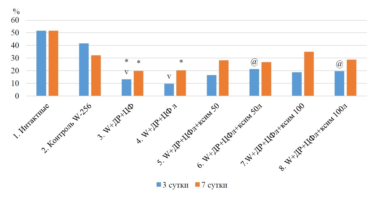 Примечания к рисункам: * – достоверные различия с интактными крысами; v – достоверные различия с W-256; # – достоверные различия с W+ДР+ЦФ; @ – достоверные различия с W+ДР+ЦФ л