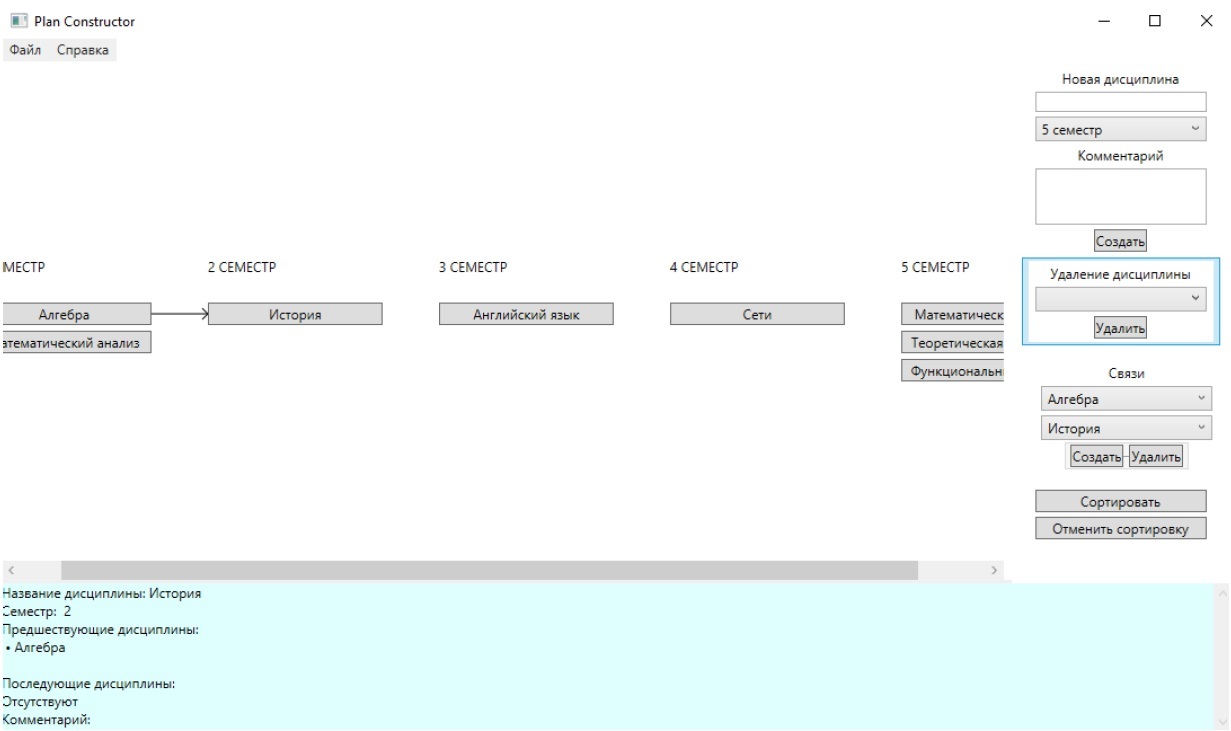 Программа содержит в себе два режима: ориентированный граф и упорядоченные по семестрам и алфавиту списки (рис. 5, рис. 6). Их различие, помимо визуальной составляющей, заключается в том, что орграф не требует немедленного указания семестра и предполагает редактирование свойств дисциплины, тогда как второй режим подразумевает проверку имеющихся данных на то, чтобы все дисциплины (как уже имеющиеся, так и добавляющиеся) шли с указанием семестра. При том важным аспектом являются взаимосвязи, так как уже на этапе создания отношения между двумя дисциплинами, идет проверка адекватности подобной связи – не поставлена ли предшествующая дисциплина на семестр впереди последующей. Переключение между режимами идет по двум кнопкам – «Сортировать» и «Без сортировки». Их нажатие вызывает методы, которые меняют состояние глобальной переменной, отслеживающей то, какой режим на данный момент активирован в программе.