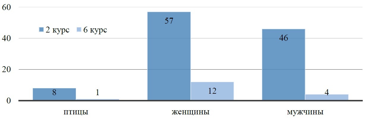 Так, сложным вопросом в процессе анкетирования для студентов был вопрос «Кто чаще является источником урогенитального хламидиоза?». Правильный ответ «женщины» среди всех опрошенных выбрали лишь 53% (рис. 1). Значительно лучше с этим заданием справились учащиеся в 6 курса – 12 человек из 17 выбрали верный вариант, среди 2 курса лишь 57 из 112.