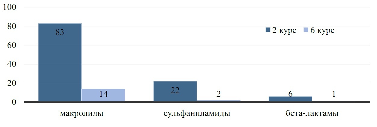 На вопрос «Какие препараты используют для лечения урогенитального хламидиоза?» правильный ответ «макролиды» выбрали 72% от общего числа опрошенных, среди студентов 2 курса данный ответ выбрали 83 человека, а среди студентов 6 курса – 14 человек (рис. 4).