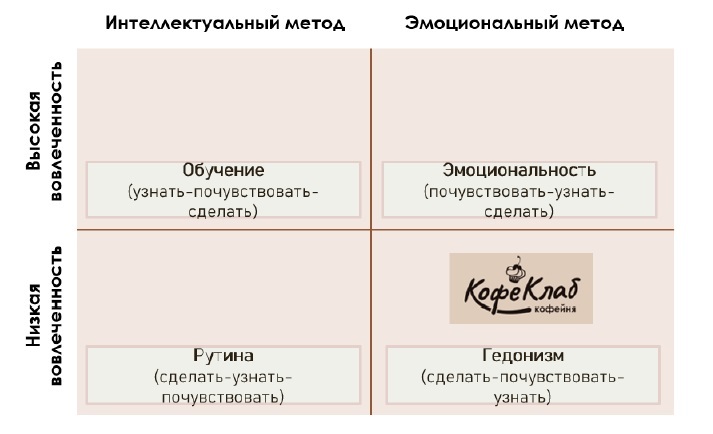 «Кофе Клаб» находится в правом нижнем квадранте, где слабая вовлечённость сосуществует с сенсорным методом познания. Здесь расположены продукты, доставляющие «маленькие радости», и для которых важна гедоническая составляющая.