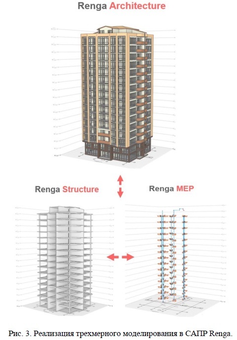 Российская компания Renga Software вместе с АСКОН и «1С» разработала базовые продукты для проектирования и информационного моделирования зданий, сооружений: Renga Architecture – для архитектурно-строительного проектирования; Renga Structure – для конструктивной составляющей зданий и сооружений (металлические и железобетонные конструкции); Renga MEP – для проектирования инженерных систем зданий. Платформа Renga предоставляет возможность совмещения свободного моделирования с объектным представлением конструктивных элементов; позволяет реализовать архитектурные решения здания и сооружения, придать полноценный индивидуальный внешний вид объекту, осуществить проектирование здания любой сложности. Реализация трехмерного моделирования и взаимодействие систем показаны на рис. 3.
