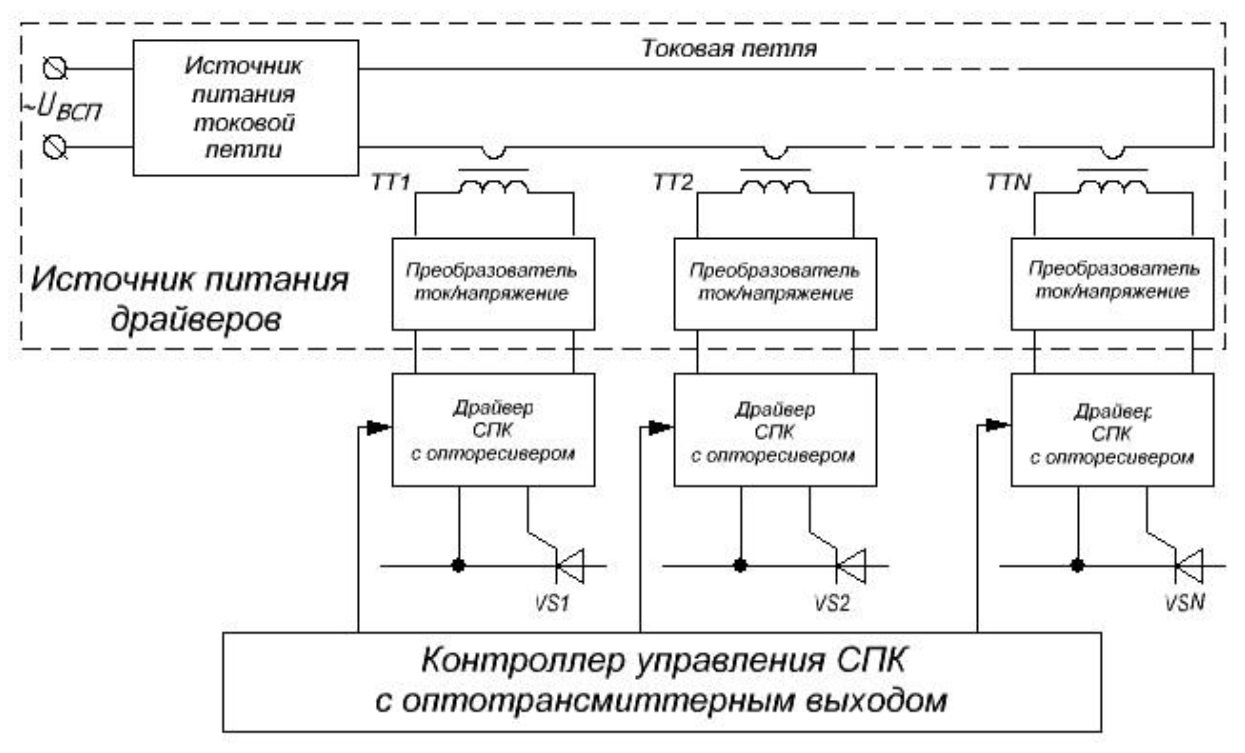 Схема источника состоит из источника питания токовой петли (ИПТП), собственно токовой петли (ТП), трансформаторов тока ТТ1, ТТ2…ТТN, где: N – количество тиристорных ключей, и преобразователей ток/напряжение (ПТН). Питание ИПТП осуществляется от вспомогательного источника переменного напряжения UВСП.