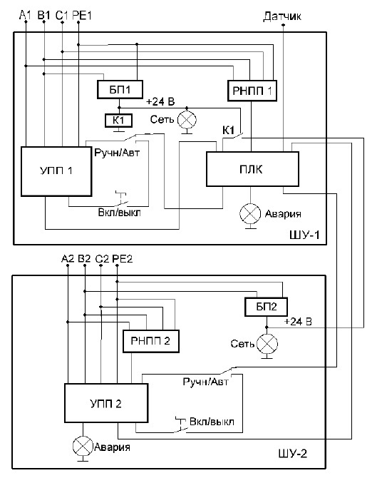 Ради повышения надежности данной системы, было принято решение о том, чтобы разработать два шкафа управления, пространственно-разнесенные друг от друга в различные помещения. Для питания оборудования, размещенного в этих помещениях, подведено отдельное силовое напряжение. Соответственно система управления состоит из двух шкафов. В каждом шкафу размещены силовые элементы управления соответствующим насосом. Если произошла пропажа силового питающего напряжения одного из шкафов, система управления должна автоматически перейти на питание от силового питающего напряжения другого шкафа. В таком случае управление осуществляется только тем одним насосом, который размещен в помещении, где присутствует силовое питающее напряжение.