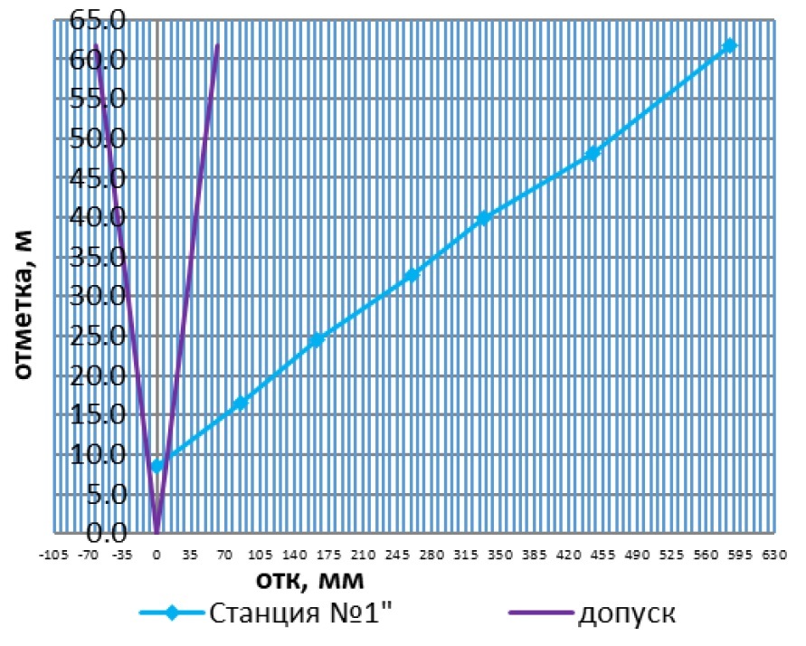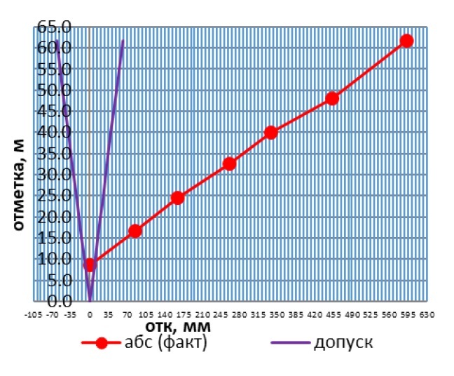 Анализируя журналы угловых измерений, можно установить, что значения отклонений от вертикальной оси ствола башни не соответствуют допустимым значениям, и самое большое значение абсолютного отклонения составляет 593 мм на отметке + 61,7 м.