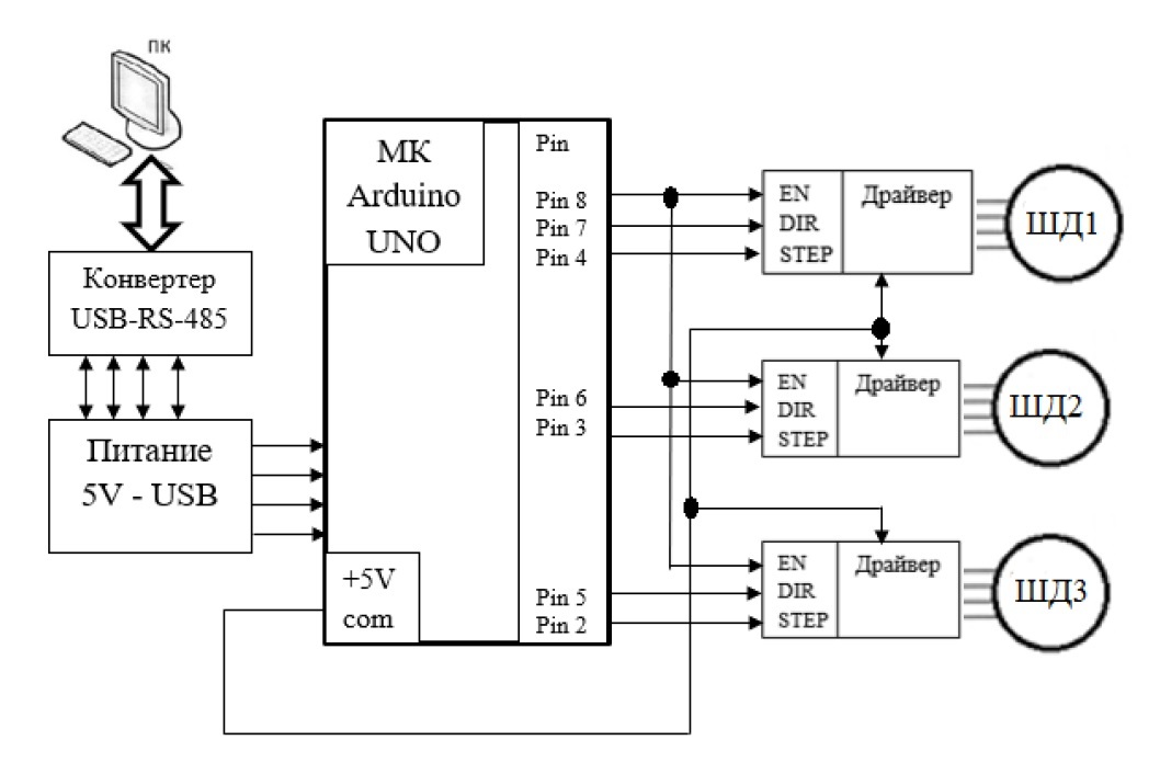 Функциональная схема системы управления ШД показана на рисунке 2. Она включает следующие объекты: персональный компьютер с портом USB (в силу традиционности); микроконтроллер; три электронных драйвера и сами ШД. Порт USB традиционно используется для передачи управляющих импульсов на устройство управления – его использование обеспечивает простоту соответствующих схемотехнических решений.