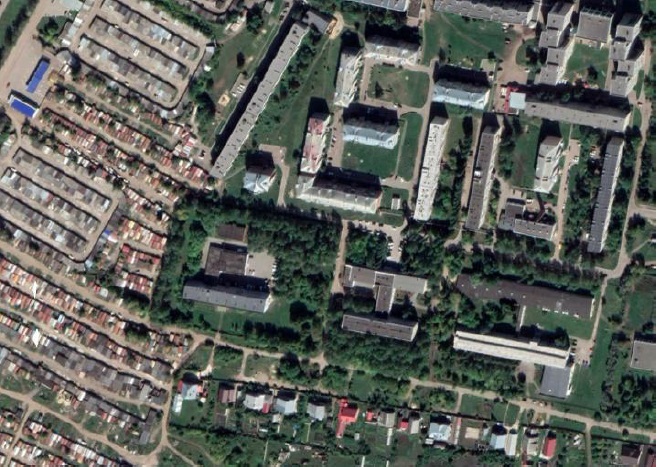 Строения и сооружения в большинстве случаев определяются по геометрически правильной форме. Здания показываются разными оттенками – от серого до практически белоснежного тона. Цвет крыши строения нередко может указывать на назначение самого здания. Например, крыши синего цвета чаще всего встречаются у промышленных объектов, а небольшие здания с красной крышей вполне могут быть объектами торговли. Кварталы образуют ячеистую правильную структуру. Форма жилых домов, как правило, геометрически правильная. Гаражную застройку можно распознать по размеру строений и их кучности расположения (см. рис. 1).
