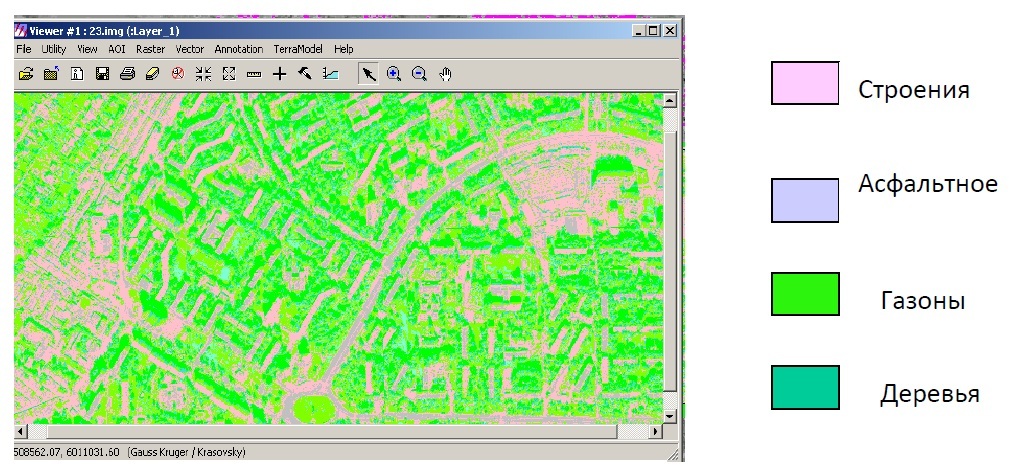 Гибридная классификация изображений высокого разрешения показала в этом плане лучший результат. Так, прежде всего, в отдельный класс удалось выделить дороги.