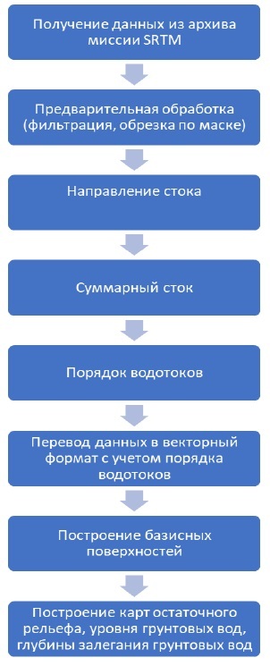 Основной источник воды хозяйственно-питьевого назначения, обеспечивающий до 80% населения в достаточно крупных населённых пунктах, а также предприятия Оренбуржья, – отложения аллювиального водоносного горизонта. Исходные данные для определения глубины залегания уровня грунтовых вод были представлены, прежде всего, материалами космической съемки радиолокационной (радарной) топографической миссии SRTM (международного проекта по созданию цифровой модели рельефа нашей планеты) [19; 29; 31] и разнообразными сведениями об особенностях геологического строения исследуемой территории и протекающих на ней геологических, гидрогеологических и геоэкологических процессах [1; 3; 6; 7; 25]. Главную роль при этом играло рассмотрение водоносных и водоупорных комплексов, водовмещающих горных пород, параметров их водопроницаемости и водоносности [1; 3; 4; 6; 10; 25; 30].