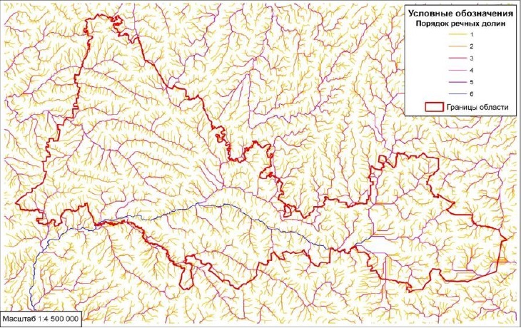 Рис. 2. Карта речных долин Оренбургской области разного порядка.