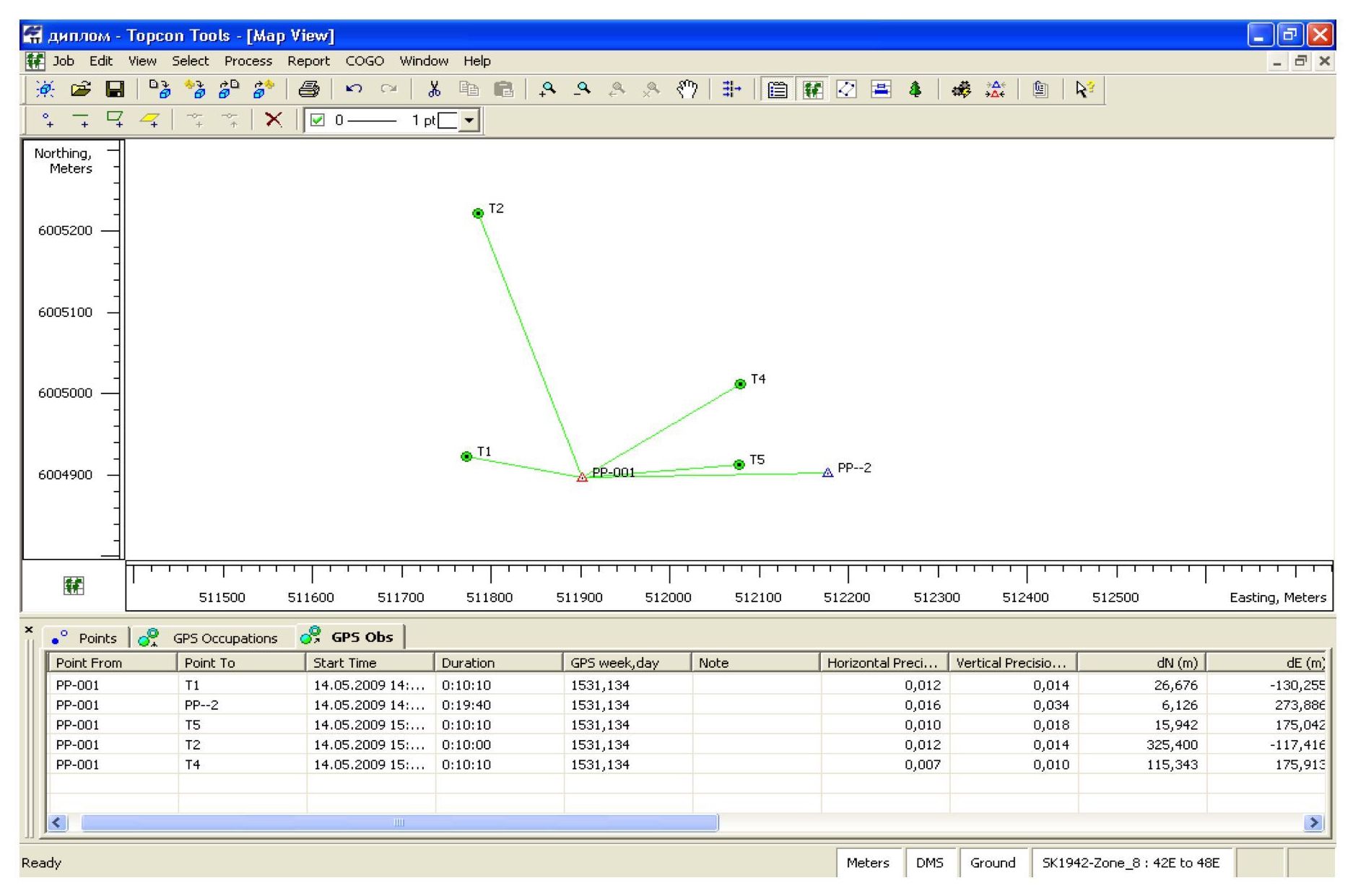 Геоданные, полученные в результате съемки, передаются с GPS-приемников на компьютер. Дальнейшая обработка, как правило, осуществляется в специализированном программном обеспечении [2]. В настоящей работе обработка проводилась в программе Topcon Tools.