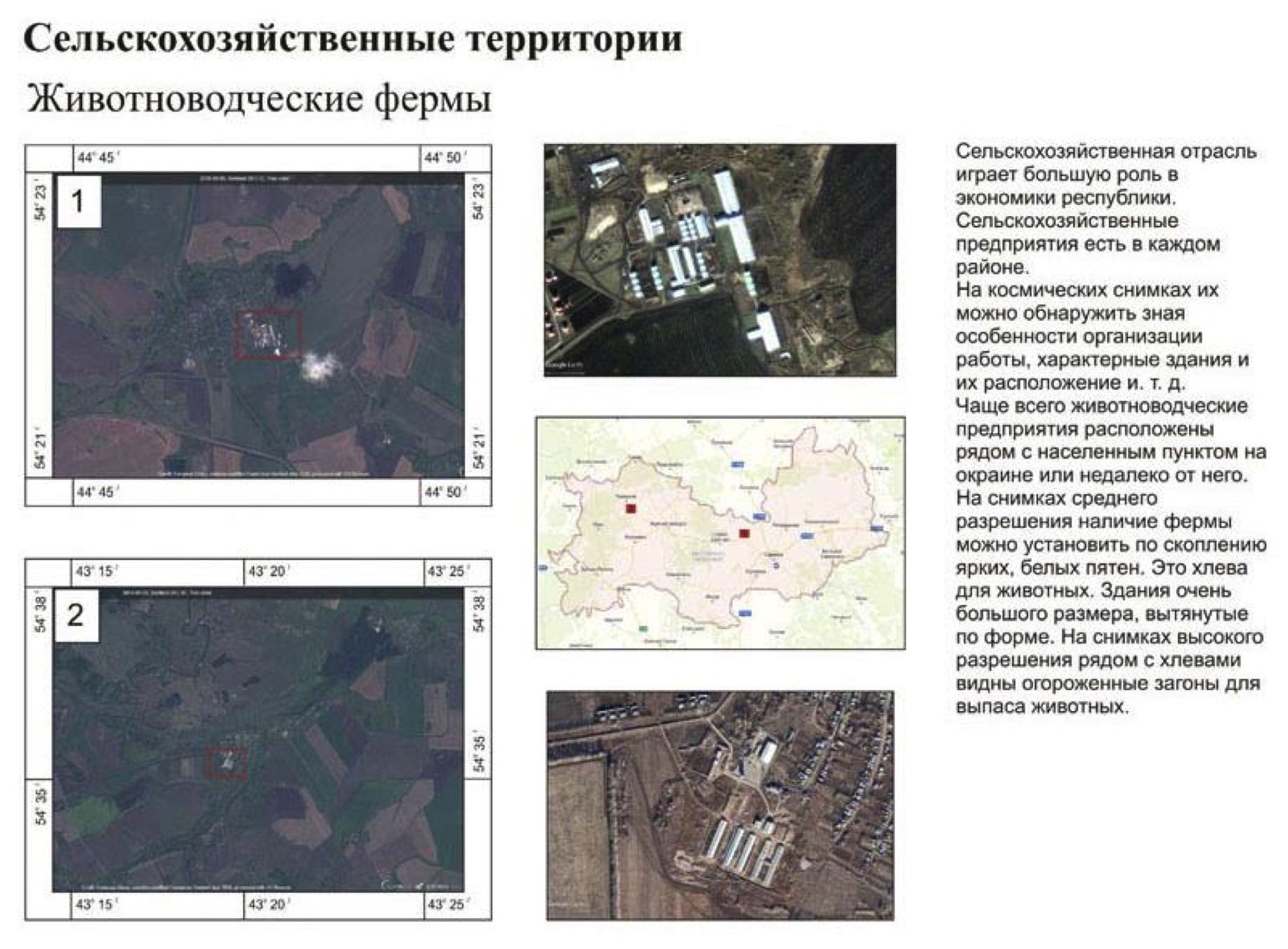 На территории РМ широко распространены пахотные земли. Сельскохозяйственные поля легко определяются по своей правильной геометрической форме. Как правило, они разделены лесополосами. Животноводческие фермы можно определить по характерному взаимному расположению построек, которые, в свою очередь, отличаются от жилых домов размерами, яркостью, наличию огороженного участка (загона) для выпаса скота (см. рис. 2).