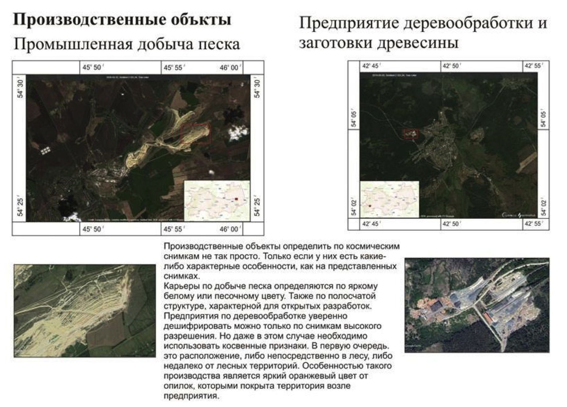 Карьеры по добыче песка определяются на снимках по цвету и полосчатому рисунку, характерному для разработок открытых горных выработок. Предприятие по обработке и заготовке древесины также определяется по цвету, желтым или красноватым оттенкам от опилок и наличию бревен, уложенных в штабеля.