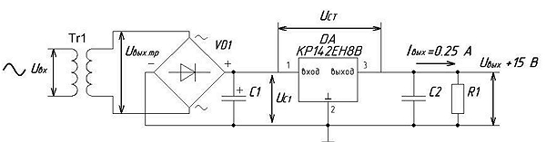 Рис. 1. ЭПС линейного источника питания для ОУ с выходным напряжением Uвых= +15 В.