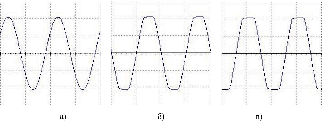 Рис. 3. Формы сигналов выходного напряжения с трансформатора при различных значениях сопротивлении вторичной обмотки Ri: а) 0,1 Ом; б) 5 Ом; в) 10 Ом.