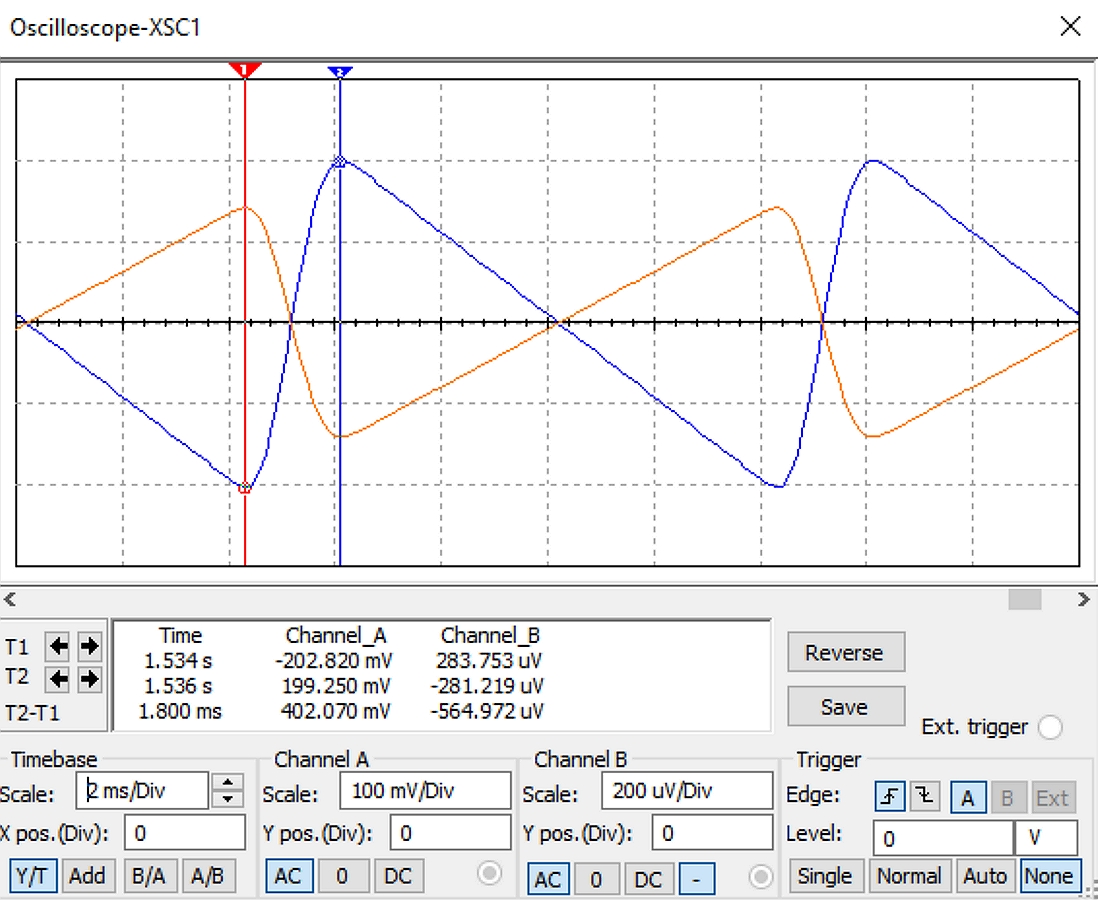 При моделировании значения выходных пульсаций напряжения Uвых.пул определялись по величинам размахов показаний пульсаций с экрана виртуального осциллографа. На рисунке 4 подробно показано как проводились измерения.
