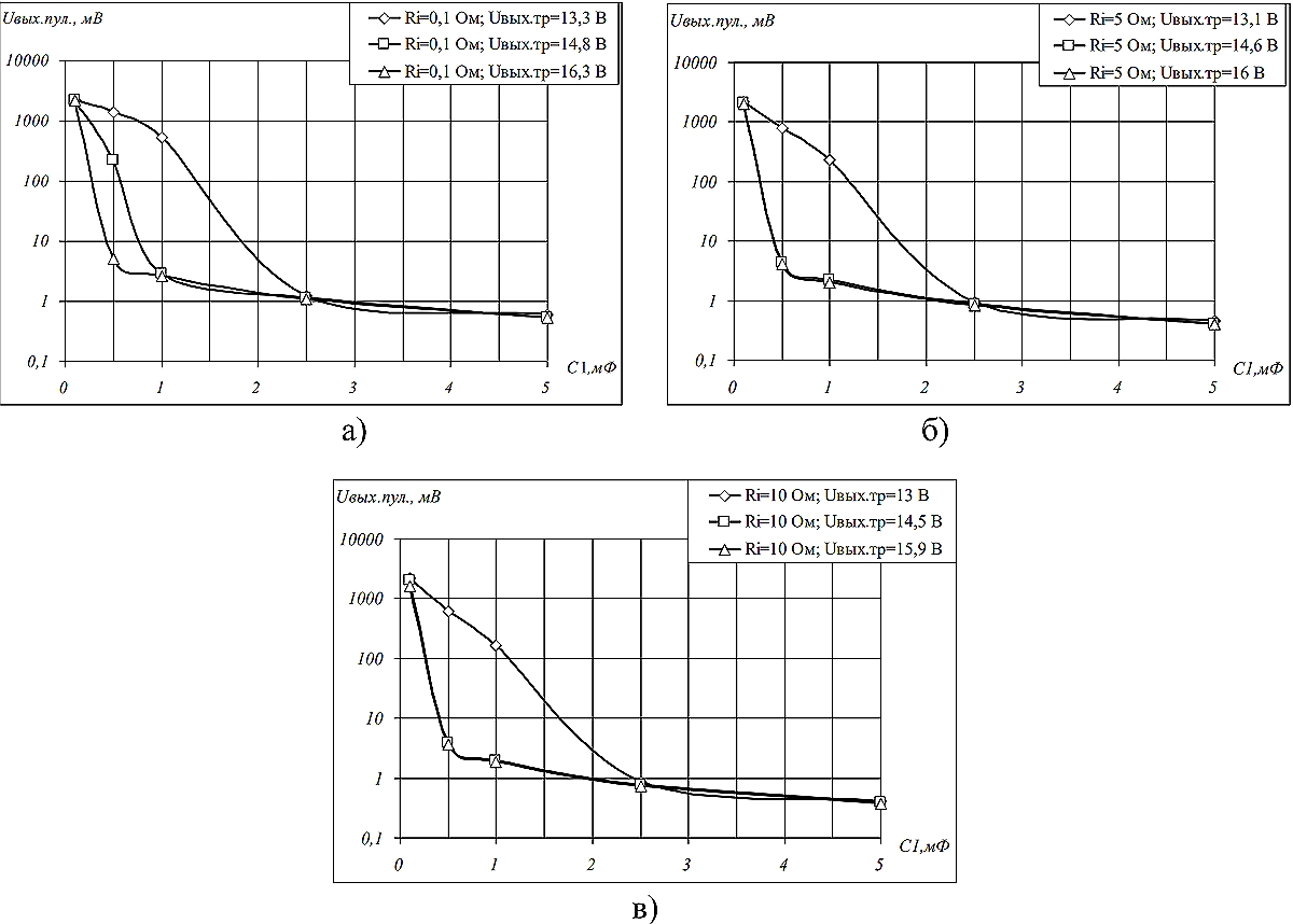 Рис. 5. Графики зависимостей выходных пульсаций Uвых.пул. от ёмкости сглаживающего фильтра C1 при Ri: а) 0,1 Ом; б) 5 Ом; в) 10 Ом.