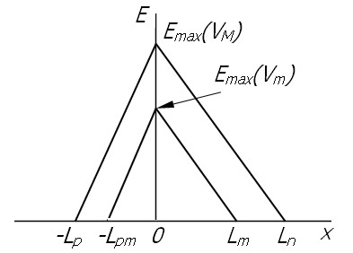 При исследовании вероятности включения микроплазмы при заполнении глубоких центров в микроплазменном канале необходимо точно знать местоположение области эмиссии носителей, участвующих в запуске лавины, так как коэффициент ударной ионизации зависит от электрического поля. На рисунке 1 представлено распределение электрического поля в p–n-переходе при двух напряжениях VM и Vm.