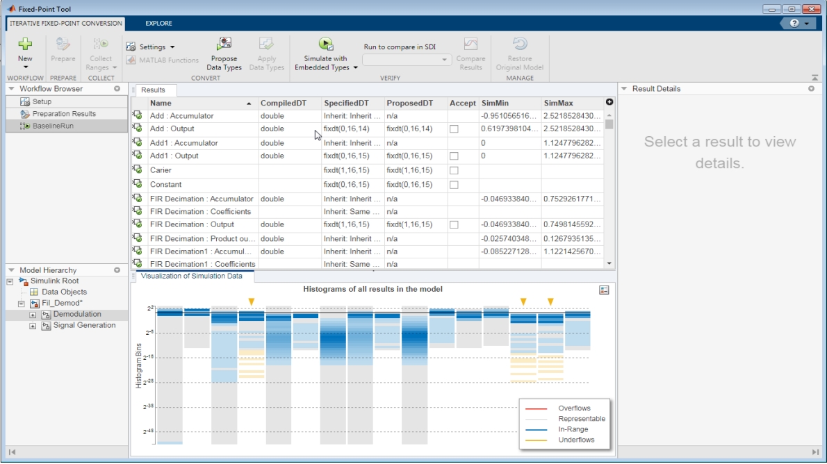 Представленная модель работает с переменными типа double. Но ПЛИС не работают с целочисленными переменными, поэтому необходимо подобрать и настроить переменные с плавающей точкой. С использованием инструмента Float-point Tool создан Subsystem-элемент, переименованный затем в Demodulation для более точной идентификации. Для вызова инструмента Float-point Tool необходимо на ранее созданном элементе вызвать контекстное меню и выбрать Float-point Tool. Откроется окно инструмента (рис. 2).